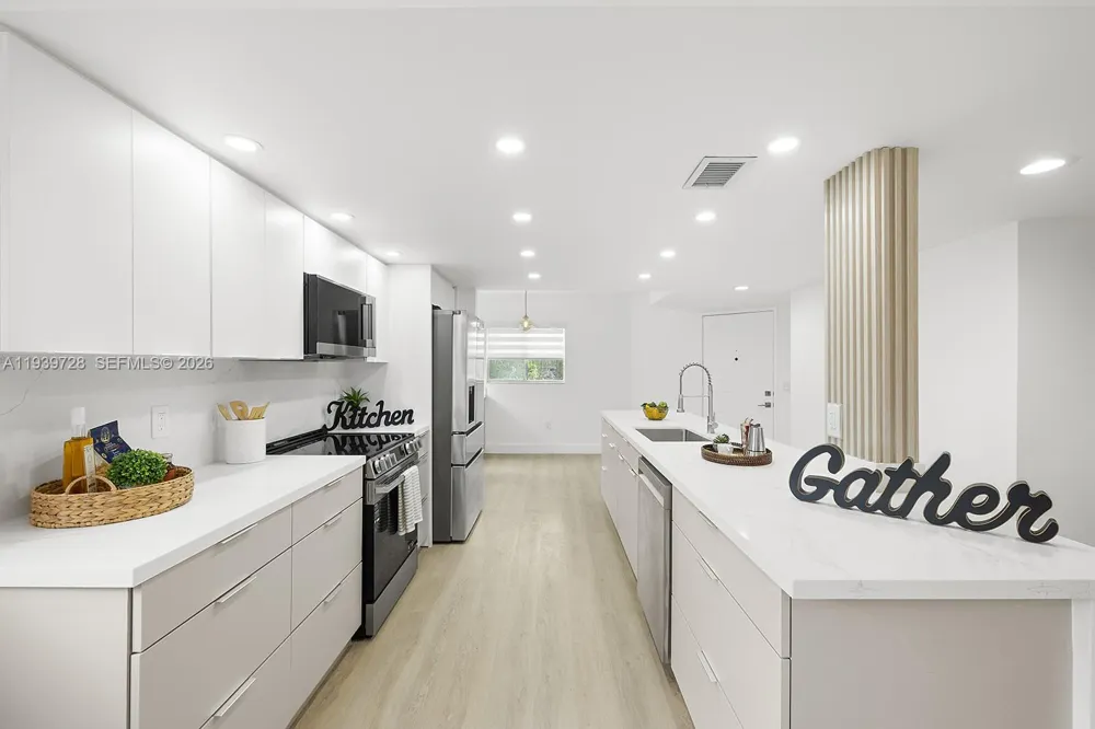 Beautifully renovated 2 bedroom, 2 bath residence overlooking lush garden views. The open contemporary kitchen offers tall modern cabinetry, quartz countertops and new stainless steel appliances. New vinyl flooring, freshly painted interiors and stylishly remodeled bathrooms add a clean, elegant feel throughout. The A/C was replaced in 2020. A Brand new, big-size washer and dryer and a tankless water heater provide modern comfort and efficiency. Relax while taking in beautiful views and enjoy the convenience of a corner unit with more windows and lighting throughout. HOA fees are $563/month (includes water cable, internet and master insurance) plus $291/month for spectacular million-dollar clubhouse with endeless activities, golf course, teather, bus shutter and much more! Situated in Ivanhoe III at Century Village, a premier 55+ community in Pembroke Pines, close to shopping, entertainment, and major highways.